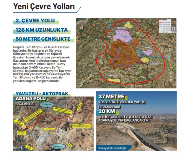 Gelişen şehrin yeni çevre yolu ihtiyacı için Başkan Fatma Şahin yeni projesiyle sorunu çözecek. 126 kilometre uzunluğunda, 50 metre genişliğindeki yeni çevre yolu, doğuda Tem Otoyolu ve D-400 karayolu bağlantısı ile başlayarak, güneyde Güneyşehir yerleşimini ve Oğuzeli ilçesinin kuzeybatı ucunu çevreleyecek. Gaziantep’in batı ucundan devam etmek üzere kuzey batı uçtan D-400 Karayolu ile Tem Otoyolu bağlantısını sağlayarak kuzeyde Kuzeyşehir yerleşimini de kapsayarak Tem Otoyolu ve D-400 karayolu ile yeniden bağlantı sağlanacak.