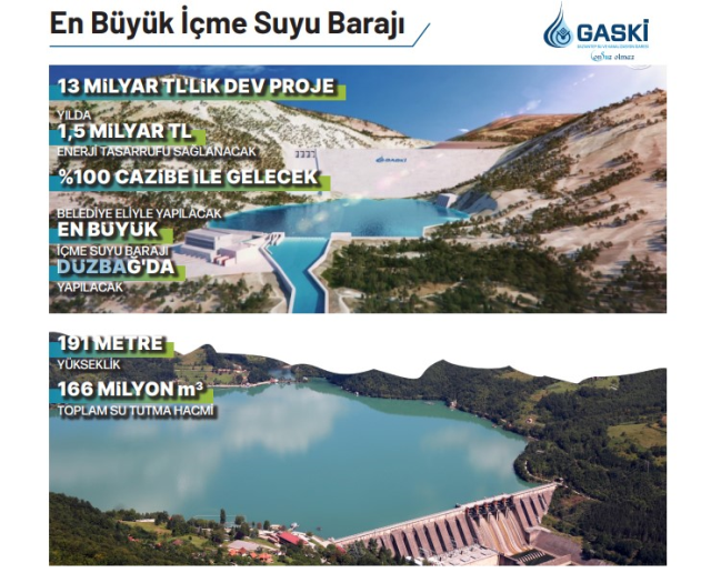 Gaziantep’in 2050 yılına kadar su ihtiyacını giderilmesi için hayata geçirilen Düzbağ İçme Suyu İsale Hattı’nın devamı olacak, belediye eliyle inşa edilecek en büyük içme suyu barajı Düzbağ Barajı yapılacak. 191 metre yüksekliğindeki baraj, yüzde 100 cazibeyle gelecek suyla yılda 1.5 milyar TL enerji tasarruf sağlayacak, 166 milyon metreküp toplam su tutma hacmine sahip olacak.