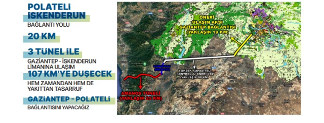 Polateli İskenderun’a 20 km’lik bağlantı ve Amanoslar’a yaklaşık 25 kilometrelik tünellerin açılmasıyla mesafe 107 kilometreye düşecek. Gazi şehrin dünya pazarlarına ulaşımı için önemli bir anahtar olacak İskenderun Limanı’na tünellerle mesafe 107 kilometreye düşecek, zaman ve yakıttan tasarruf sağlanacak.
