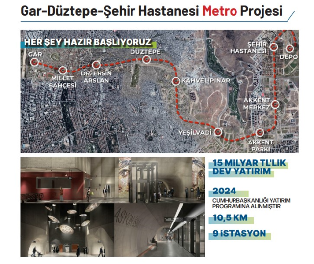 Cumhurbaşkanlığı tarafından 2024 yatırım programına alınan, Gazi şehirde toplu taşımada yeni bir dönem başlatacak Gar – Düztepe – Hastane Sürücüsüz Metro Hattı Projesi için geri sayım başladı. 10 kilometre 440 metre uzunluğundaki 9 istasyon ve 39 tren seti kapasiteli depodan oluşacak 15 milyar TL’lik dev yatırım olan metro hattı, toplu taşımada güvenliğin, konforun ve memnuniyetin artmasını sağlarken, yeşil şehrin ulaşım standartlarını da koruyacak.