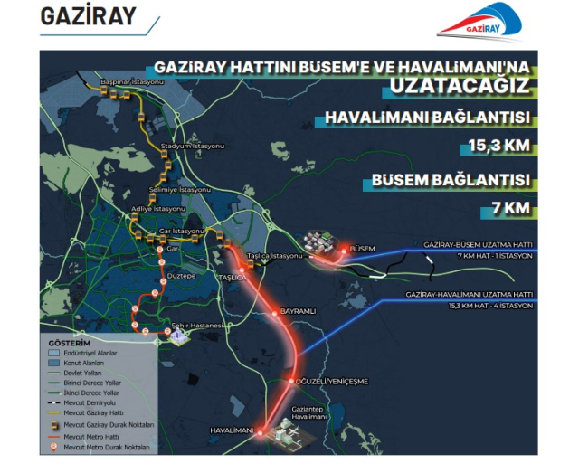 Gaziantep’in ulaşımında önemli bir dönüm noktası olan ve bugünkü rakamıyla 30 milyarlık değere sahip GAZİRAY’ı Havalimanı ve BÜSEM bağlantıları yapılarak uzatılacak.