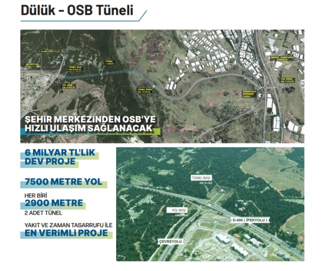 Dülük Tüneli ile 10 OSB’si 250 bin çalışanıyla Türkiye’nin sayılı sanayi bölgelerinden olan Gaziantep Organize Sanayi Bölgesi’ne ulaşım kesintisiz olarak gerçekleştirecek. 5 bin 800 metre uzunluğundaki Dülük Tüneli’yle OSB – kent merkezi hattı için çevre yolu ile alternatif bağlantı sağlanacak. Projenin, Dülük Ormanı kısmı 2 bin 900 metrelik 2 tünelden oluşacak ve ormanın doğal ve tarihi yapısı da korunmuş olacak. 6 milyar TL’lik dev proje, Çevreyolu ile D-400’ün kesişim noktasından başlayacak, OSB ve Adana-Şanlıurfa Otoyolu’na (TAG) bağlanacak. Tünel kısmı gidiş geliş 3’er şeritten oluşacak. Proje tamamlandığında yakıt ve zaman tasarrufu sağlanacak.